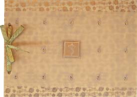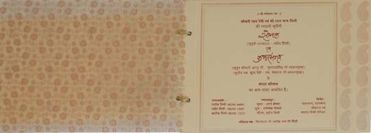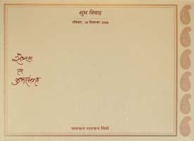 This cream colored perfumed sheet card is a stricking combination of ethnic and modern design. The front of the card is graced by gold ribbon tied to hold both inserts adds a touch of ethnic flavor decorated by golden colored stones with customise features to change symbol.The envelope in same color is also graced by golden printed embossed borders. The interleaf has same golden color borders. |
