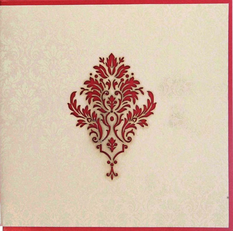 This amazingly designed invitation card is made from superior quality Red shimmer finish metallic card stock includiong two inserts of Golden & Red colour. The exclusive matching envelop will surely reflect your elite taste. Gold foiled design on the envelope makes this invitation card a class apart. The rich design theme and exclusive materials used to create this invitation card will surely reflect your elite taste. Card front has a beautiful motif design created through laser cutting process.