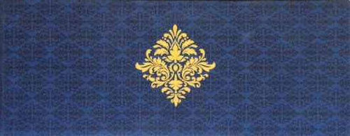 A classy and elite invitation is made of Navy Blue satin material having base with self printed motifs & large Golden Shade motif on front. The matching rich shimmer finished envelop & two Golden shimmer metallic inserts with the border of golden foil is captivating.