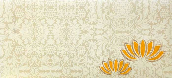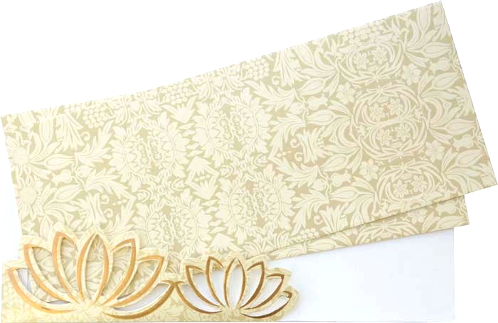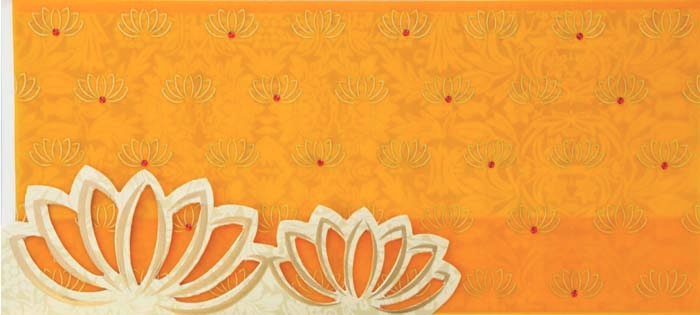 The beautiful translucent yellow card has a Golden floral design throughout front decorated by rhinestones. The matching Envelop is made of self textured shimmery finished card stock. Two matching inserts are covered with translucent sheet kept in the pocket of laser cut flower gives a captivating look. |