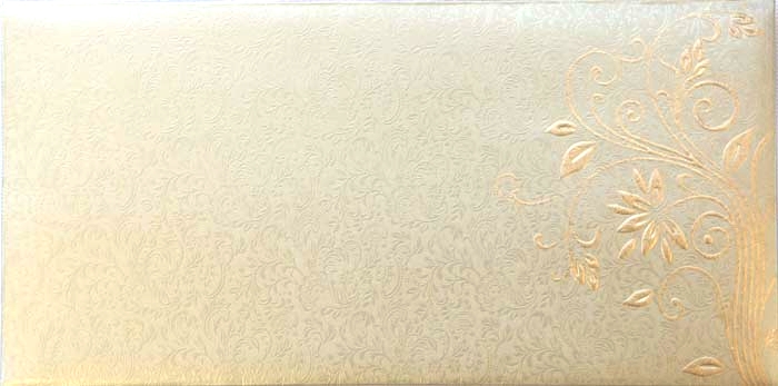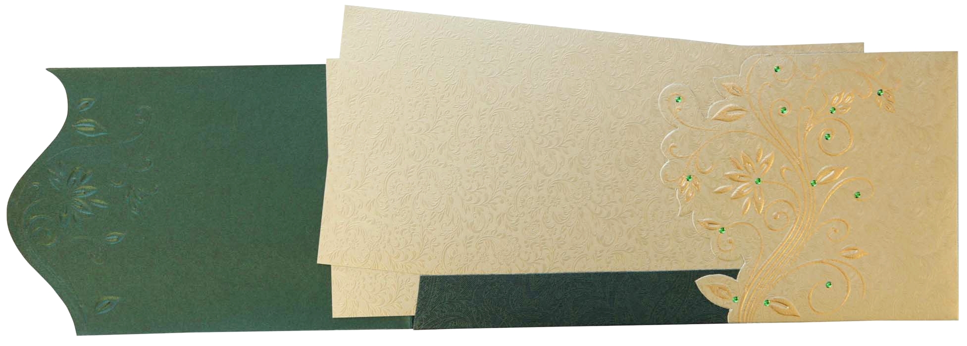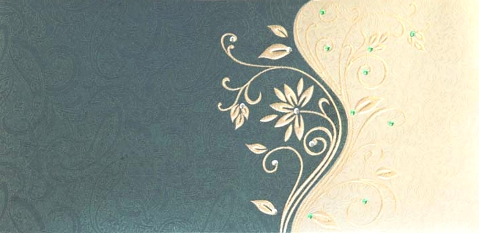This card is made of Green colour theme with self printed Paisley design on shimmer metallic sheet with raised floral Design. The shimmer Metallic envelop & two inserts are exclusively matching with the card theme.