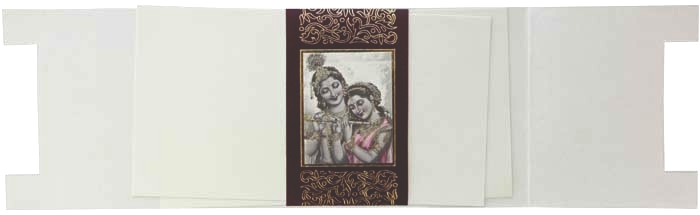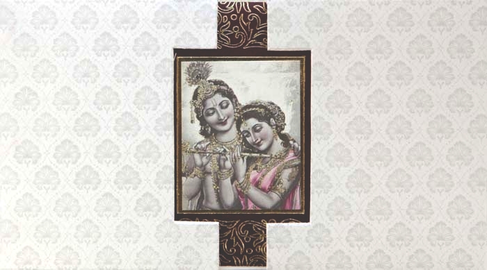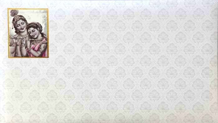 This off white cream door opening style card is made of self textured shimmer metallic card stock decorated. The flash cut on front opening edge, is taking out the Raadha Krishna printed in Golden foil Border on inserts pocket cover in centre. The matching Envelop with self printed motifs on front & matching plain inserts are simply mesmerizing. |