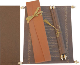 For occasions as special as a wedding,introducing a range of exquisitely scroll invitation in bronze and orange color combination. Main scroll invitation with perfect bronze color pearl wooly sheet(90 gms)sheet as matching thin box envelope in orange shimmery sheet in 200 gms with golden silken ribbon and outer mailing envelope for postage. Making a most precious invitation for you to select sets the standards of performance and expressions. |