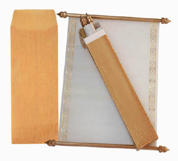 Royal cream color scroll invitation on wooly fabric sheet with designer box in golden foil prints, comes with matching zari tassel and outer mailing envelope for postage,creating a language unique to itself with its characteristics. |