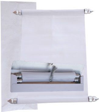 The latest in rich white color curious velvet scroll invitation delivers what your imagination.The plain scroll is with silver bars and silver zari tassel,comes with box envelope too has a silver tassel and provides a very good contrast. |