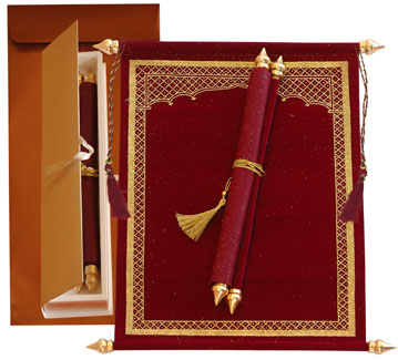 Delirious, superiors and finest quality velvet scroll invitation in rich Burgundy color.The main scroll with finest quality glittering effect design all around,plain scroll is with golden bars and golden zari tassel,comes with matching box and ribbon, mailing envelope,for the daring few - to match the brilliance of your ideas. |
