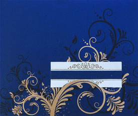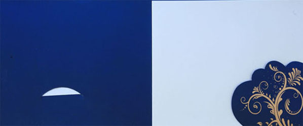 The card is made up of shimmering blue and off white sheet with prominent off white color leaves, beautiful ornamental design on the card and fine floral printing in the background adds an excellent touch. The card holder is made using same paper to give that extra appeal with little white stones embedded on it, available with two inserts and outer mailing envelope. |