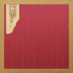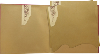 A breathtaking creation with an embedded essence of royalty. This regal two fold shimmer sheet card in maroon color has the upper fold adorned by images of traditional print embellished by golden foil kilangi decorated by glittering stones and kundans. The inner portion,interleaf and the envelope are made of glistering golden color sheet. |