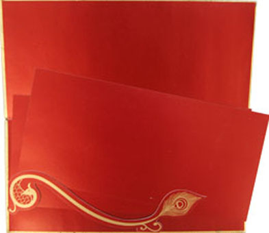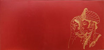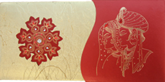 This stylish hardbound invitation card is made of shimmery finish sheet in wine color with bride groom graphic sketch artwork in golden foil on front folder and envelope which makes it different. Card front is half covered with designer jacket, imprints,motif and kundan work comes with two plain beautiful inserts. Text in golden raise effect on inserts and envelope will be magical to make it impressive. |