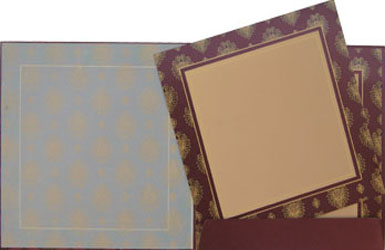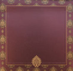 This elegant and stylish NON-hardbound invitation in Rich Maroon color is made from finest quality shimmery finish sheet. Card front is covered with designer imprints, beautiful golden floral designs and two inserts and envelope are with same theme composition. |