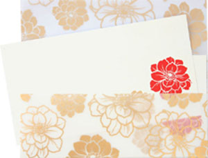 This exclusive red and golden theme design is printed on off white card stock sheet using translucent butter paper jacket with fine shimmering printing over it. Available with set of two inserts and envelope having same theme pattern with free text printing offer. Golden raised or red ink is preferable for text. |