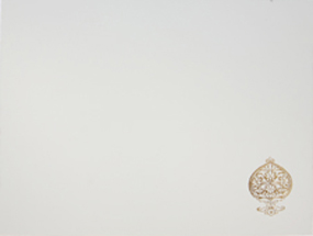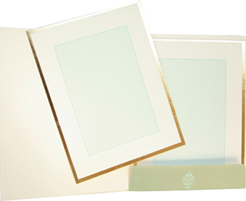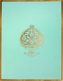 A very modern and artistic presentation of invitation in light turquoise color with golden foil printed motif in front and on mailing box envelope, two interleaves with golden foil border is something different from entire range. |
