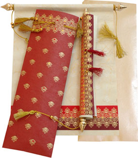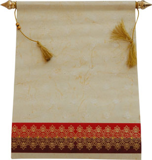 This new handmade paper scroll invitation is a tribute to the traditional art of the handcrafting, form an ideal basis for the creation of high-quality and precious printed matter.Front shown with the floral design base golden motif structures and other side to print invitation,comes with matching mailing envelope and box.It is the Invitation that you leave behind to spellbind others. |