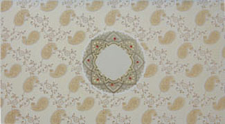 A stylish pattern has beautiful paisley design printed all over on front of self texture card stock. Front of the hand bound card is decorated with kundans and golden foil motif to print initials or symbol of your choice. Two inserts and envelope are with same theme composition. |