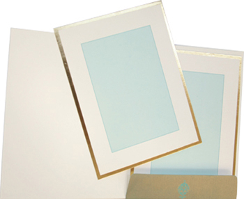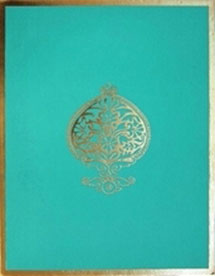A very modern and artistic presentation of invitation in turquoise color with golden foil printed motif in front and on mailing box envelope, two interleaves with golden foil border is something different from entire range. |